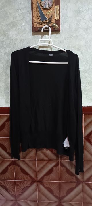 Chaqueta negra con brillos dorados. Talla L/XL. Con cierre de corchetes. Muy suave y cómoda. Marca Patty Moon.