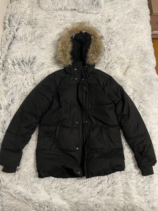 Chaqueta de la marca Bershka en color negro. Se encuentra en buen estado. - Capucha con forro de pelo. - Cierre de cremallera y botones. - Bolsillos con cremallera en la manga. - Cordón ajustable en la cintura.