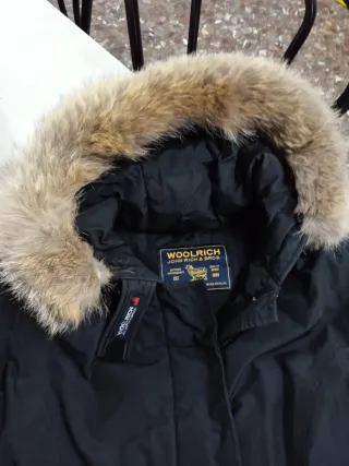 Abrigo plumífero de la marca Woolrich en color negro. Cuenta con un detalle de pelo en la capucha. - Capucha con pelo. - Cierre de cremallera.
