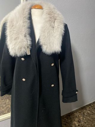 Abrigo largo de polipiel con detalles de pelo. - Cierre de corchetes. - Cuello y puños con pelo sintético. - Detalle de pelo en la parte delantera central. - Largo hasta la rodilla. Precio negociable.