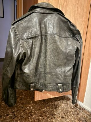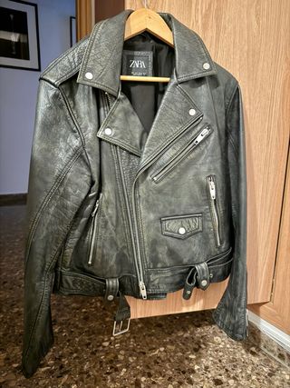 Chaqueta de piel estilo motero con un diseño clásico y atemporal. piel bovina. solo tiene una puesta. - Cierre de cremallera frontal. - Bolsillos con cremallera. - Cinturón ajustable en la cintura. - Cuello con solapas y botones a presión.