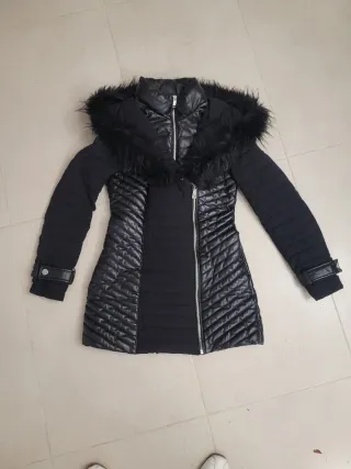 Elegante abrigo largo de la marca Guess. Se está pelando el cuello y el escote, el resto del abrigo está bien. Se puedo arreglar en una costurera. - Diseño acolchado con detalles en polipiel. - Capucha con acabado de pelo sintético. - Cierre frontal con cremallera. - Puños ajustables con detalle de polipiel.