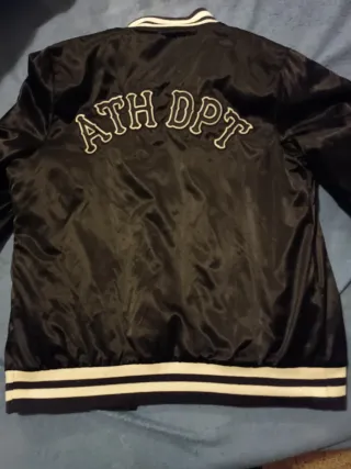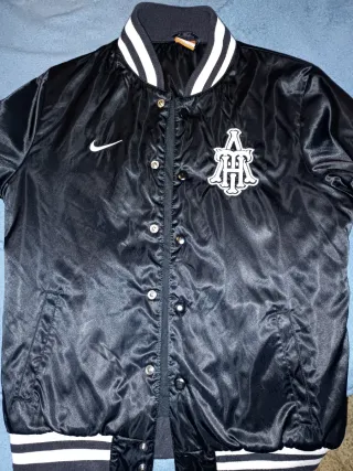 Chaqueta estilo beisbolera de la marca Nike, con un diseño clásico y deportivo. - Logo de Nike bordado en el pecho. - Escudo del Athletic Dept en el frente. - Cuello y puños con detalles de rayas. - Cierre de botones a presión.