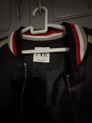 Chaqueta hombre estilo bomber con detalles en dorado y negro. - Diseño con cuello y puños a rayas. - Cierre de cremallera frontal. - Mangas en contraste de color.