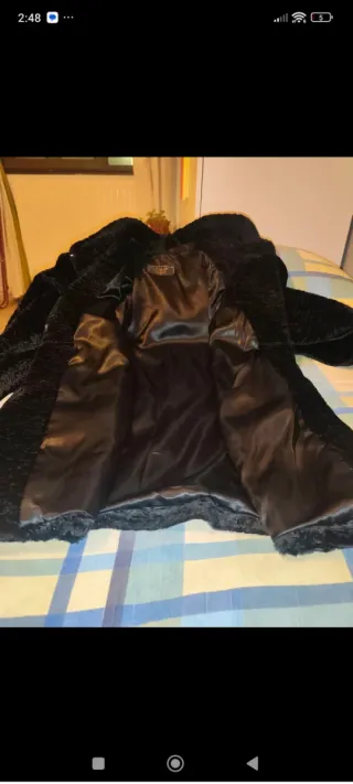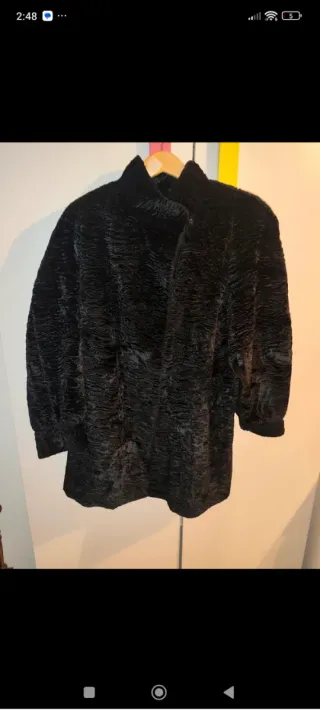 Abrigo negro de mujer largo, llega por encima de las rodillas. Pone talla XS pero da más talla. Más bien es como una S. Tiene una axila descosida, los puños deshilachados y le faltan los pelos de la capucha (ver fotos), pero abriga y es muy cómodo. Te lo doy si lo recoges en la puerta del IES Arca Real, Valladolid.