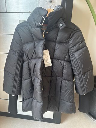 Abrigo negro con un diseño acolchado y forro interior suave. - Capucha integrada. - Cierre de cremallera. - Bolsillos laterales.