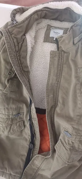 Abrigo de la marca Pepe Jeans para niño, en color verde. - Capucha con forro de borreguito. - Cierre de cremallera y botones. - Bolsillos delanteros con solapa. - Forro interior naranja Talla 12 años Con muy poco uso
