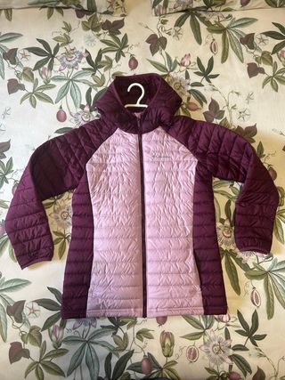 Abrigo acolchado de la marca Columbia, con un diseño bicolor. -Talla XL niña. - Parte frontal y mangas en color rosa pálido. - Laterales y mangas en color burdeos. - Capucha integrada.