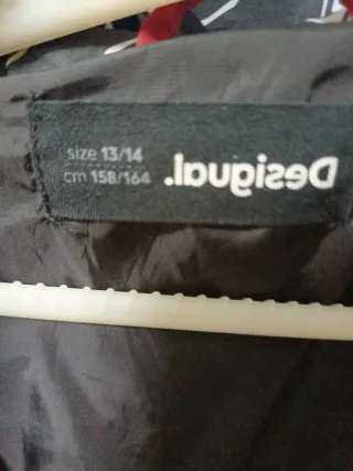 Abrigo de niña de la marca Desigual, talla 12 años. Presenta un diseño vibrante con un estampado floral multicolor sobre fondo negro. - Cuello con pelo sintético. - Capucha. - Cierre de cremallera.