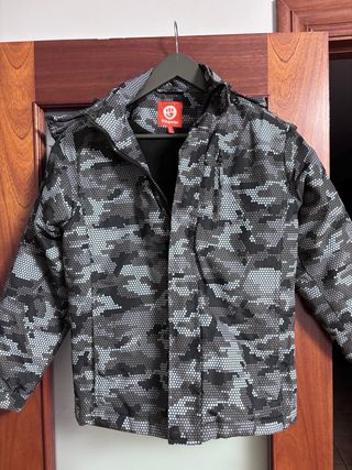 Chaqueta infantil con un diseño de camuflaje moderno y llamativo. - Estampado hexagonal en tonos grises, negros y blancos. - Cierre de cremallera frontal. - Bolsillos laterales con cremallera.