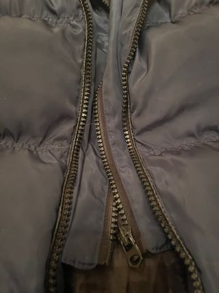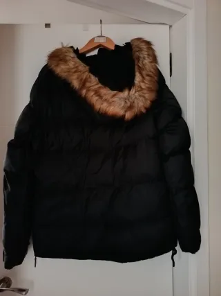Abrigo acolchado con capucha y detalles de pelo sintético. - La capucha no se quita - Diseño moderno y cálido. - Cierre frontal con cremallera. - Bolsillos laterales con cremallera. - doble cremallera - tiene una pequeña mancha en manga