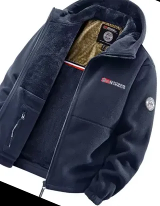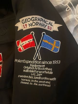 Abrigo de la marca Geographical Norway. - Diseño con parches de banderas de Noruega y Suecia. - Inscripción Polar Expedition since 1953. - Detalles de bordados y texto en la manga.