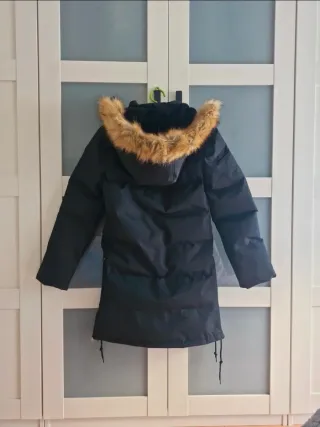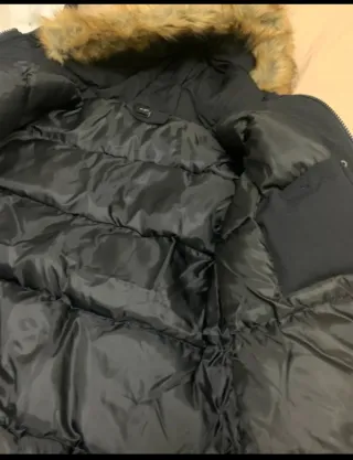Abrigo acolchado con capucha de pelo sintético. - Cierre de cremallera y botones. - Bolsillos laterales con cremallera. - Detalle de logo bordado en el pecho. - Puños ajustados. Estado excelente, como nuevo Envío rápido 📦🚄