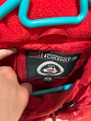 Abrigo de la marca Geographical Norway en color rojo. Presenta un diseño moderno y funcional. Talla 44/46. Tiene una pequeña mancha negra en la manga como se ve en la foto. - Capucha con pelo. - Bolsillo frontal con parche. - Bandera de Noruega en el pecho.