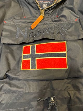 Abrigo estilo anorak de la marca Norway, con un diseño inspirado en expediciones polares. - Diseño frontal con bolsillo tipo canguro. - Capucha ajustable. - Detalles en color rojo. - Parche de la bandera de Noruega y Polar Expedition en la manga.
