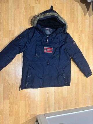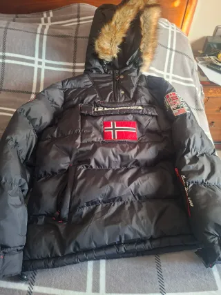 Parka de hombre negro de la marca geographical norway, apenas usado y orginal. Precio negociable. Es una talla M aunque grande, también llega para talla L - Diseño tipo anorak. - Bolsillo frontal grande. - Capucha ajustable. - Detalles de la bandera de Noruega.