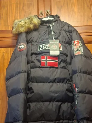 Abrigo de la marca Geographical Norway. - Diseño con parches de banderas de Noruega y Suecia. - Inscripción Polar Expedition since 1953. - Detalles de bordados y texto en la manga.