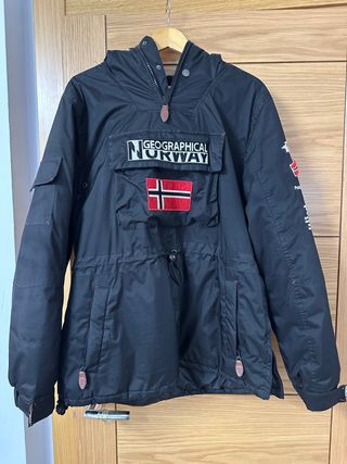 Cazadora negra de Geographical Norway con capucha y detalles distintivos. - Diseño con logo de Geographical Norway en el pecho. Como nueva apenas 2 usos Se vende por desuso - Bandera de Noruega en la parte frontal. - Capucha con pelo sintético. - Bolsillo frontal con cremallera y cordón ajustable en la cintura.