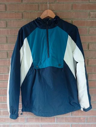Usado una vez. Cortavientos oversize deportivo unisex en colores blanco, azul marino y verde. Si no te gusta muy grande, serviría para una S e incluso una M. Se viste desde la cabeza, ya que la cremallera llega hasta el pecho, lo que permite que tenga un gran bolsillo central, además de los dos laterales, todos ellos cerrados con corchetes. Cuenta con dos cremalleras laterales que pueden abrirse para mejor movilidad.