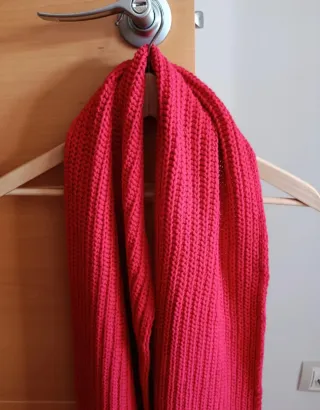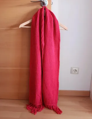 Bufanda trenzada roja, de estilo oversize, terminada en flecos. Muy calentita y combinable con todo tipo de abrigos y chaquetas. Tiene la etiqueta interior cortada. Está en perfecto estado.