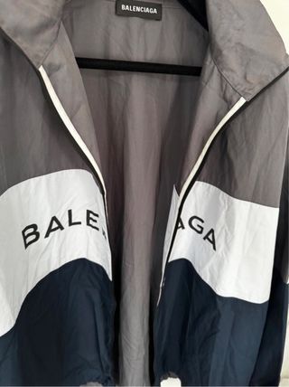 Chaqueta de estilo oversize con logo Balenciaga frontal llevada en 2 ocasiones. Vendo por no usar Se puede ver sin compromiso en Barcelona - Paneles de color gris, blanco y azul marino. - Detalle de logo en el pecho. - Mangas con franjas laterales.