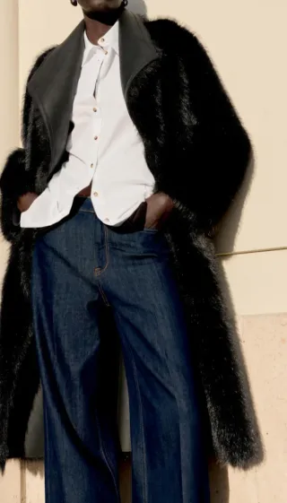 Abrigo largo de corte oversize con mangas efecto piel. - Diseño moderno y versátil. - Cierre de botones. - Bolsillos frontales con solapa.