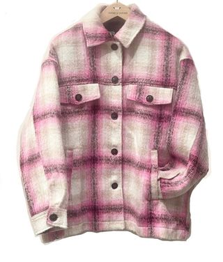 Chaqueta/ sobrecamisa de cuadros Oversized, a una persona talla S le queda holgada - Estampado de cuadros en tonos morado y blanco. - Cuello camisero. - Cierre de botones. - Dos bolsillos en el pecho. - Dos bolsillos inferiores.