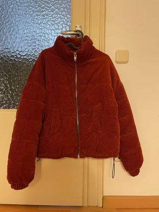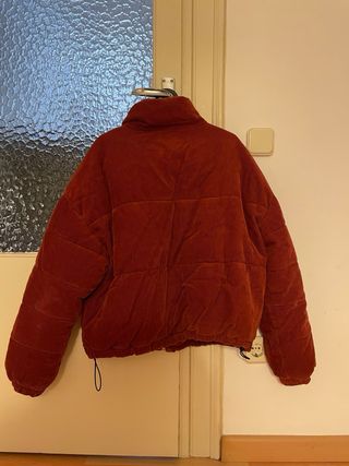 Anorak oversize de pana en color granate, ideal para un estilo moderno y abrigado. - Diseño acolchado. - Cuello alto. - Cierre de cremallera. - Bolsillos frontales. - Cordones ajustables en el bajo. - En perfecto estado.