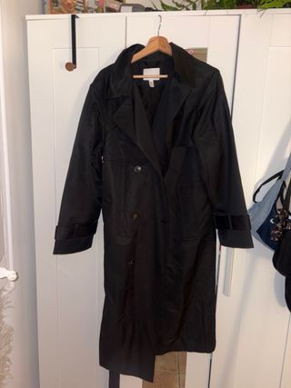 Trenchcoat oversize de H&M en color negro. Un básico versátil para cualquier armario. - Diseño largo y holgado. - Cierre de botones. - Puños ajustables con trabillas.