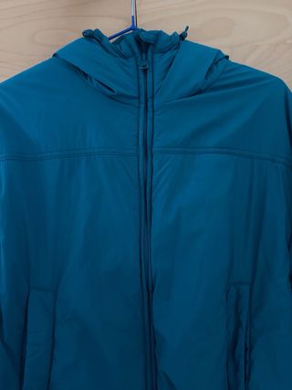 Chaqueta ligera de Oysho, talla XS, en un verde precioso (entre verde botella y verde azulado, muy favorecedor). Tiene capucha, bolsillos laterales con cremallera.La cremallera central es doble dirección (se puede abrir por arriba y por abajo). Es muy ligera y cómoda, ideal para entretiempo o para llevar en la mochila. En la parte inferior de la cremallera le falta un pequeño diente y a veces se atasca al cerrarla desde abajo. Cerrándola con cuidado funciona, y es algo que se puede arreglar fácilmente. Por lo demás está en muy buen estado.