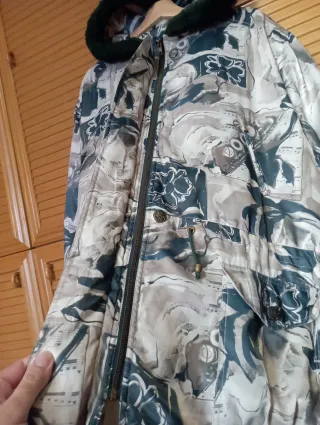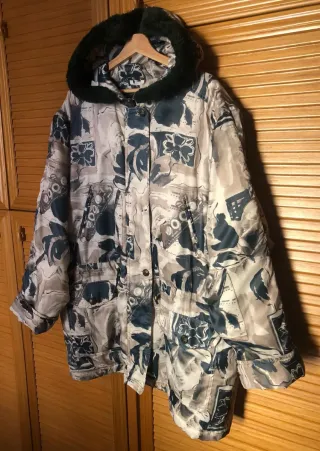 MÁS REBAJADA HOY! Chaqueta vintage corte oversize con capucha, estampado abstracto e imágenes musicales en tonos verdes oscuro y beige. • Botones vintage y cremallera frontal. • Cordón para ajustar en la cintura y forro interno. • Tejido ligero (no pesa) 100% poliéster. Usada, con algún desgaste en tejido, le falta el último botón de abajo y los cordones ajustables del gorro y bajos (ver últimas 2 fotos). Todo lo demás en buen estado. • Oversize, corte amplio. Se sugiere para talla 3XL, 4XL ó más. IMPORTANTE VER MEDIDAS: Largo: 85 cm. Ancho: 65 cm. De hombro a hombro: 55 cm. Sisa manga: 35 cm. Envíos: Sí. Entr