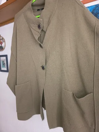 Chaqueta tipo poncho de la marca Parfois en color verde oliva. Un diseño moderno y versátil. - Cierre con botones. - Bolsillos frontales. - Corte tipo poncho. Con mangas, talla grande hasta una 50. Oversize