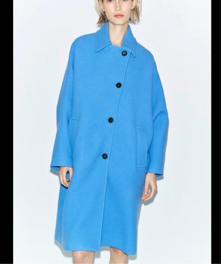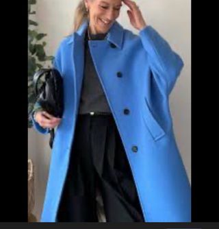 Abrigo estilo oversize de Zara en un llamativo color azul. Su diseño es moderno y versátil. - Corte amplio y cómodo. - Cierre de botones. - Bolsillos frontales. Usado un solo día tiene etiquetas internas solo no está la externa pero no es se ha usado más e un día PERFECTO estado