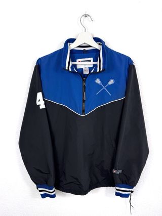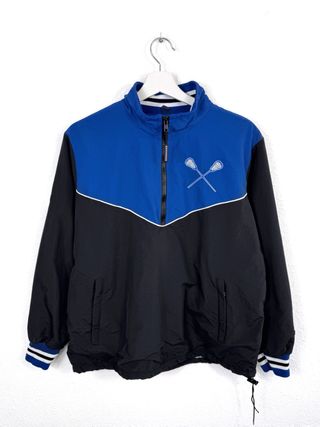⚡ Cortavientos de media cremallera hecho en Estados Unidos. 🏷️ Talla L Oversize 📏 Medidas: 69cm de largo x 60cm de axilas 🎨 Color: Negro y azul ✅ Estado: Bueno, solo tiene unas marcas que se muestran en las fotos 🔎 Detalles: Diseño tipo de media cremallera, bolsillo laterales, logos bordados, de lacrosse americano