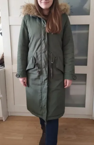 Abrigo largo de estilo oversize. - Diseño con capucha y pelo. - Cierre de cremallera y botones. - Cordones ajustables en la cintura. - Bolsillos frontales con solapa. - Puños abotonados. acolchado por dentro,con cordón para ajustar,capucha de pelo desmontable, super caliente,largo por debajo de la rodilla,muy abrigado, viene muy grande,la talla de la etiqueta pone S pero es una L