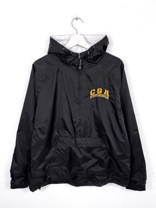 Chaqueta cortavientos negra y amarilla hecha en Estados Unidos. Tiene varias marcas que se muestran en las fotos. Talla M Oversize 69cm de largo x 61cm de axila a axila