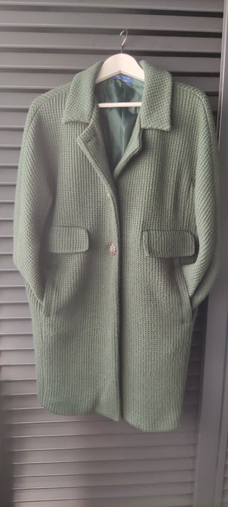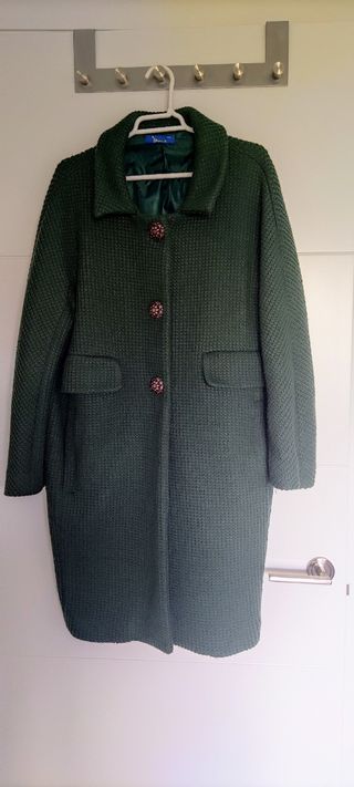 Abrigo oversize de entretiempo italiano, marca "Manía" de color verde, con cuatro bolsillos: dos laterales y dos de tapa. Tiene tres botones y está forrado. Talla 40 (válido para otras tallas). Acrílico. Usado muy poco y en muy buen estado. Largo 90cm.