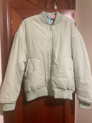 Bomber estilo oversize en color verde pastel de Topshop. Presenta un diseño acolchado y detalles de canalé en puños y bajo. - Cierre de cremallera frontal. - Bolsillos laterales con botón a presión. - Cuello redondo acanalado. Al ser oversize talla un poco más. Talla 36-38
