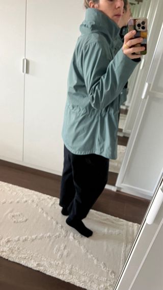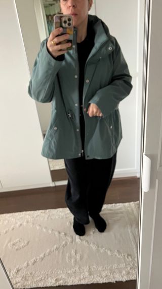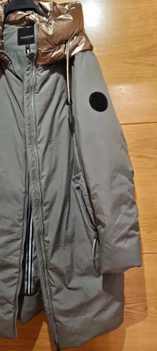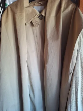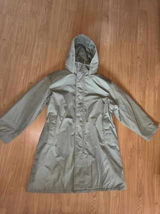 Abrigo ligero de nailon con forro en suave tejido de punto , Acabado hidrófugo. Dos grandes bolsillos delanteros Se abrocha con botones a presión en la parte delantera.y cremallera cordon interior para ajuste , gomas en puños . usado 1 vez es talla L pero al ser oversize equivale a una 46 , muy cómodo y no pesa nada, Al lavarlo para venderlo, se enganchó el cordon que ajusta la capucha, ver foto,por lo demas, está perfecto. #Abrigo #verdeoliva #capucha #UNIQLO
