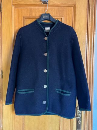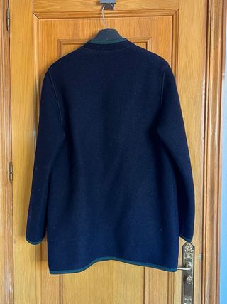 Chaqueta de lana oversize Las medidas están en las fotos. - Cuello redondo con ribete verde. - Cierre de botones. - Bolsillos delanteros con ribete. - Mangas largas La foto de la modelo está con IA para ver cómo queda