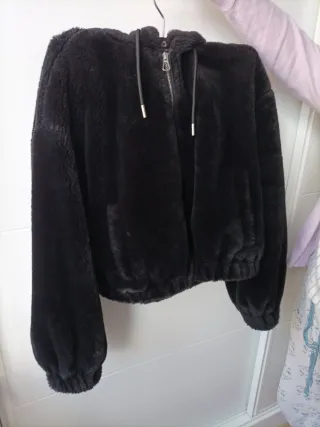 Abrigo corto de pelo sintético con cremallera. - Diseño con capucha. - Puños y bajo elásticos. - Bolsillos delanteros. -Estilo oversize -Calentito