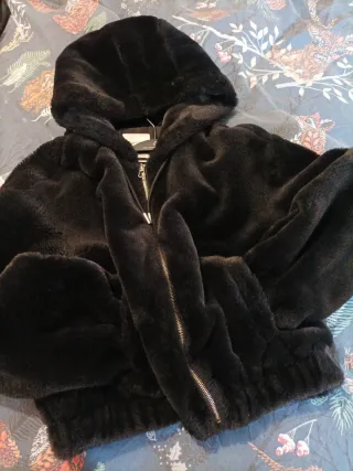 Abrigo acolchado de efecto piel. Talla xs pero es oversize - Cierre de cremallera. - Capucha. - Bolsillos laterales. Usado pero sin roces, ni arañazos ni cuarteado.