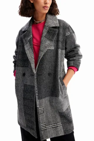 Abrigo largo oversize cruzado estilo sastre con cuello solapa, botones y tejido de paño con diseño patch. Fit: Oversize Largo: A la rodilla Diseño de patch en pata de gallo y espiga Cuello pico con solapa Manga larga ancha Dos bolsillos laterales Cierre cruzado de botones Forrado Tejido con lana Silueta de hombro caído