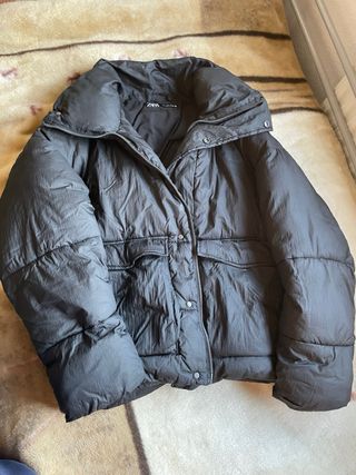 Abrigo acolchado estilo puffer de Zara. Un diseño moderno y confortable. - Corte oversize. - Cuello alto. - Cierre de cremallera y botones a presión. - Bolsillos frontales con solapa y botón.