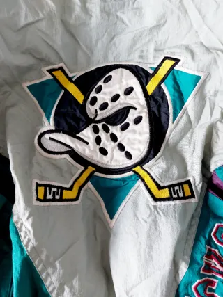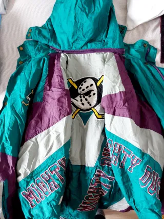 Chaqueta vintage original de los años 90, estilo cortavientos / windbreaker, con diseño color block en tonos verde turquesa, morado y blanco. Estética deportiva NHL – Mighty Ducks (Anaheim Ducks), con parches bordados en el pecho y gráfico grande en la espalda. Corte oversize, muy cómoda y con mucha presencia, ideal para looks streetwear, retro. Tejido técnico tipo nylon, ligera y perfecta para entretiempo. Presenta signos visibles de uso acordes a su antigüedad (arrugas propias del tejido técnico, desgaste general y marcas del tiempo), lo que le aporta carácter y estética 90s. **Equivaldría a una talla S de adulto