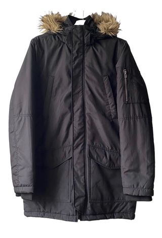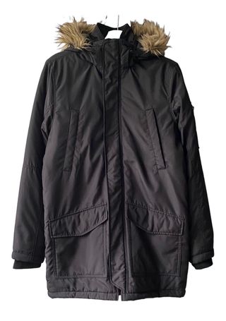 Parka de invierno H&M negra acolchada con capucha opcional. Negra, totalmente nueva, solo se ha usado dos o tres veces. Talla 14 de niños, pero sirve para S o M de adultos: mide 42 cm de hombro a hombro, 54 de axila a axila, 65 de mangas, 56 de ancho en la cadera y 82 de largo. Perfectamente unisex, estilo recto, más o menos oversize según tu talla.