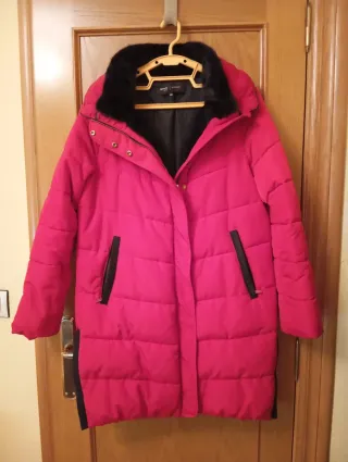 Parka color rojo ( aunque en foto parece algo fucsia) corte oversize talla 40 de Formula Joven ( El corte inglés) con pelo negro en cuello, capucha interior , aperturas en cadera y manga, remates en negro y cremalleras doradas. Abrocha con cremallera y solapa con botones en click. Largo 83 cm. Precio original 80€. Solo puesta 3-4 veces.