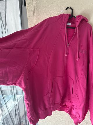Muy gordito, es muy caliente y suave. Color gris cálido. Los bolsillos habría que coserlos. Pone talla xs- pero es oversize, más bien es para s y m