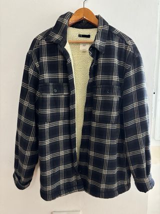 Sobrecamisa / chaqueta de cuadros con forro interior de borreguito. - Diseño a cuadros en azul marino y blanco. - Cierre de botones. - Dos bolsillos en el pecho. - Algodón y poliéster. - Usada en una ocasión, prácticamente nueva. - Talla XL / equivale a una L oversize.