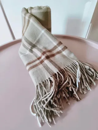 Foulard grande de cuadros en tonos beige y marrón. Tamaño oversize, ideal para llevar como bufanda tipo manta o como chal sobre abrigo. Tejido suave y agradable al tacto, aporta calidez sin ser excesivamente pesado. Flecos en perfecto estado. Muy poco uso, bien cuidada. Precio ajustado al tamaño y estado.